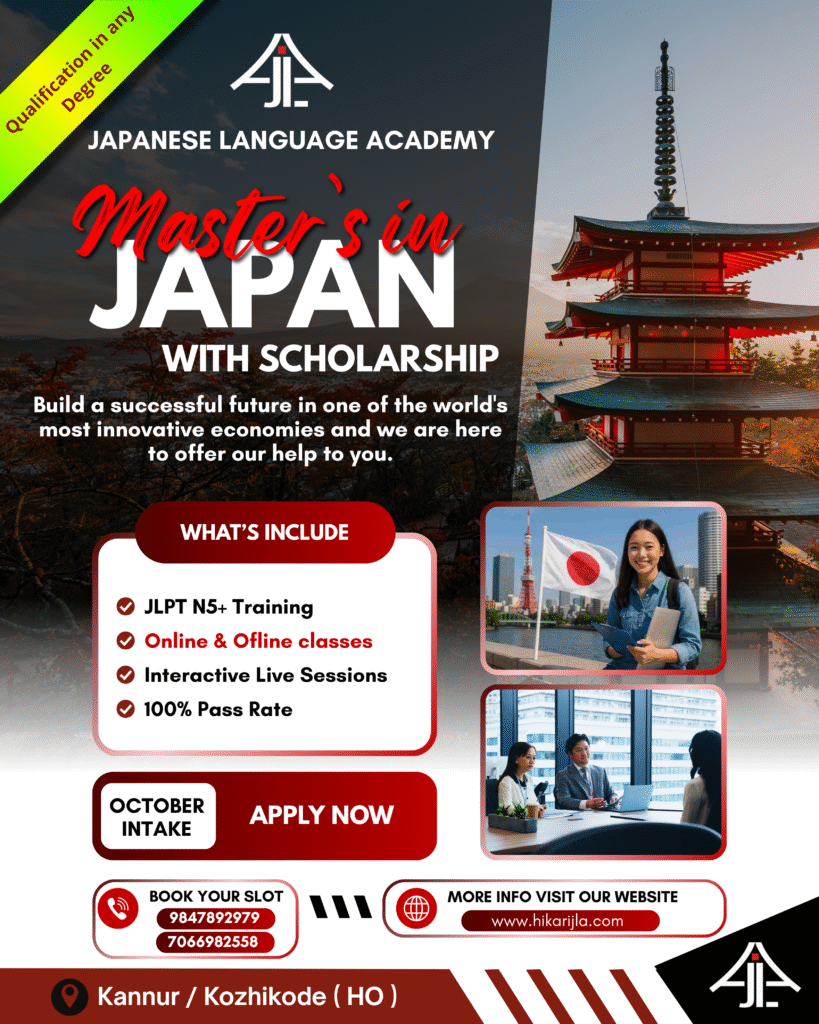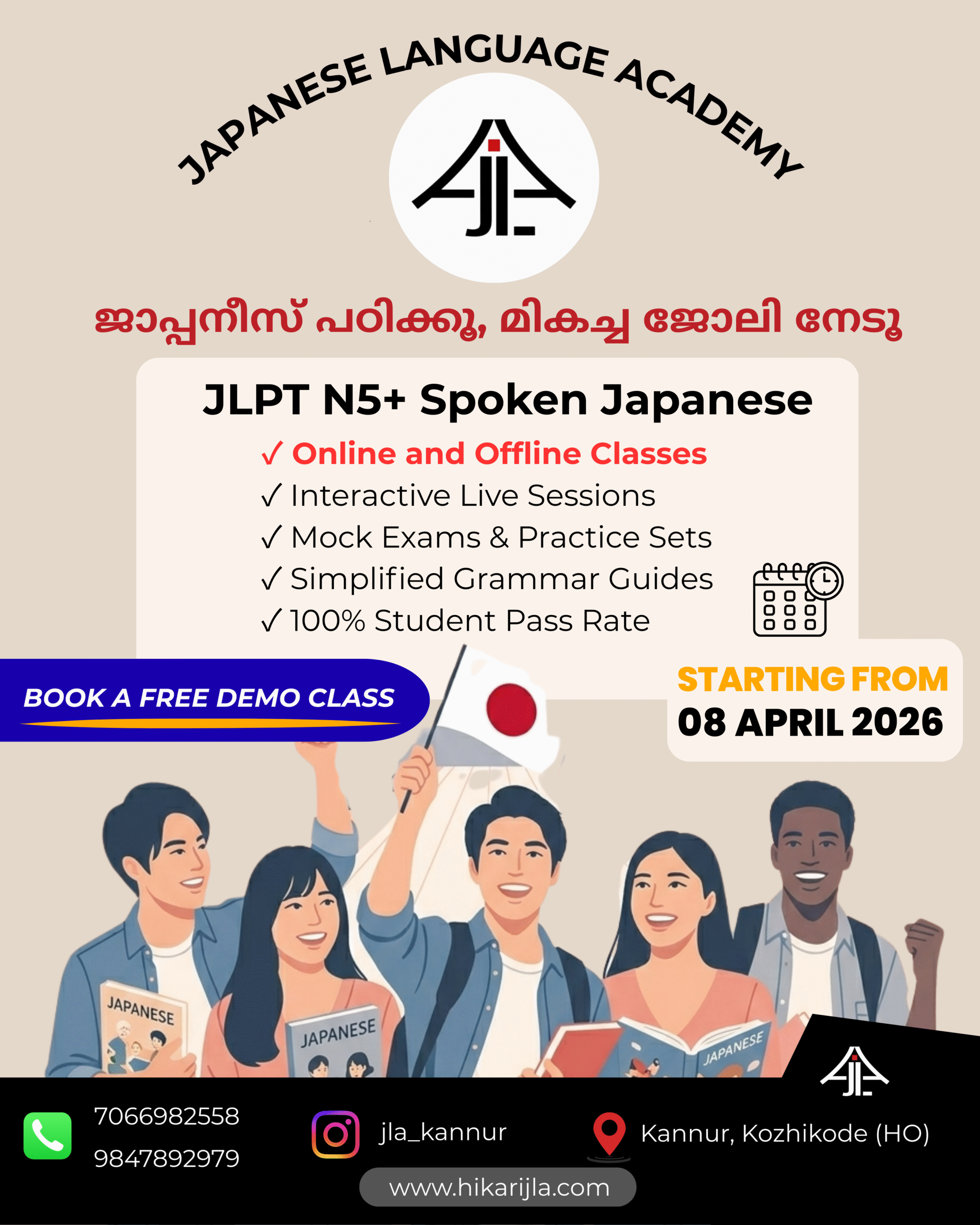 Posted on Anaida George06/07/2025Trustindex verifies that the original source of the review is Google. I give full stars to the competent Japanese Language Academy. Suresh sensei, who taught us Japanese, is a very responsible teacher and takes serious consideration of your learning period. Every class felt like it was tailor-made to maximise our grasp of the lessons. The online classes spanning the 3- month period of the course was very engaging. Sensei as well as classmates made the classes fun to learn and something to look forward to everyday. Offline classes were held twice during which I finally got to meet the same students I used to text back and forth with to understand verb forms and other tricky parts of the language :D The 2 textbooks and 2 workbooks provided were also very helpful, and well-suited for learning Japanese. All in all, I am glad I chose this academy out of all the options available out there, and I look forward to my N4 classes with them as well!Posted on Preetha Jyothirmayan01/07/2025Trustindex verifies that the original source of the review is Google. Immersive learning experience with passionate instructors. A great place to master JapanesePosted on Shailaja Suresh01/07/2025Trustindex verifies that the original source of the review is Google. Excellent learning experience.Amazing teachers, supportive environment, and great progress in Japanese skills.Posted on Drishya01/07/2025Trustindex verifies that the original source of the review is Google. Excellent Centre for learning Japanese language with knowledgeable teachers and engaging classes. Highly recommended.Posted on Sourabh Sooraj30/06/2025Trustindex verifies that the original source of the review is Google. Supportive, Efficient, and Engaging I have been learning Japanese at this institute for the past two months, and here’s my review: TL;DR – A great institute that covers Japanese from Level N5 to N2. The instructors are always willing to clarify any doubts, and the teaching is superb. Classes are conducted online and offline from Monday to Saturday. They also offer opportunities to explore life in Japan. I chose this institute because it was close to my hometown. After speaking with the instructors—who were helpful and ready to clear my endless sea of doubts—I was convinced to join. I was initially concerned about how the classes would be conducted as I work at a different location, but I was pleased to find out that they offer both offline and online classes. They teach Japanese from N5 all the way to N2, with classes running Monday through Saturday. The “sensei” (teachers) are well‑versed and always ready to clarify doubts. I noticed that lessons are structured very well: even those times when the pace of the lessons felt fast, they repeat the content in later classes, which clarifies any lingering doubts and further commits the content into memory. They also offer various opportunities for those interested to start a life in Japan—which will cater to those wanting to immerse themselves in the culture and begin a new chapter using their Japanese skills. All in all, I recommend this institute to anyone looking to kickstart their Japanese journey and/or take a peek into Japanese living. Furthermore, introducing more innovative methods of teaching and retaining the same warm and supportive atmosphere while maintaining growth will help the institute grow by leaps and bounds. Great work, Team JLA—looking forward to your continued success!Posted on ahin30/06/2025Trustindex verifies that the original source of the review is Google. Much useful institute to learn Japanese in kannur.Posted on Shahzada Sherin24/06/2025Trustindex verifies that the original source of the review is Google. Had a nice experience learning Japanese , The teaching methods of basic classes was taught precisely and every knowledge of it was easy to understand . thank you team jla , suresh sir and George sir for making this platform for the students 🙌🏻Posted on Sharanya Rajeev17/06/2025Trustindex verifies that the original source of the review is Google. Learning Japanese at this institute has been an amazing experience! The classes are extremely well-structured, engaging, and effective. Our sensei is incredibly dedicated—always available to clarify doubts, even outside class hours. The entire team is very supportive and approachable, making the learning journey smooth and enjoyable. The classrooms are spacious and well-maintained, creating a great learning environment. They also offer online classes, which are just as interactive and convenient for remote learners. If you're looking to learn Japanese in a supportive and professional environment, I would highly recommend this institute!